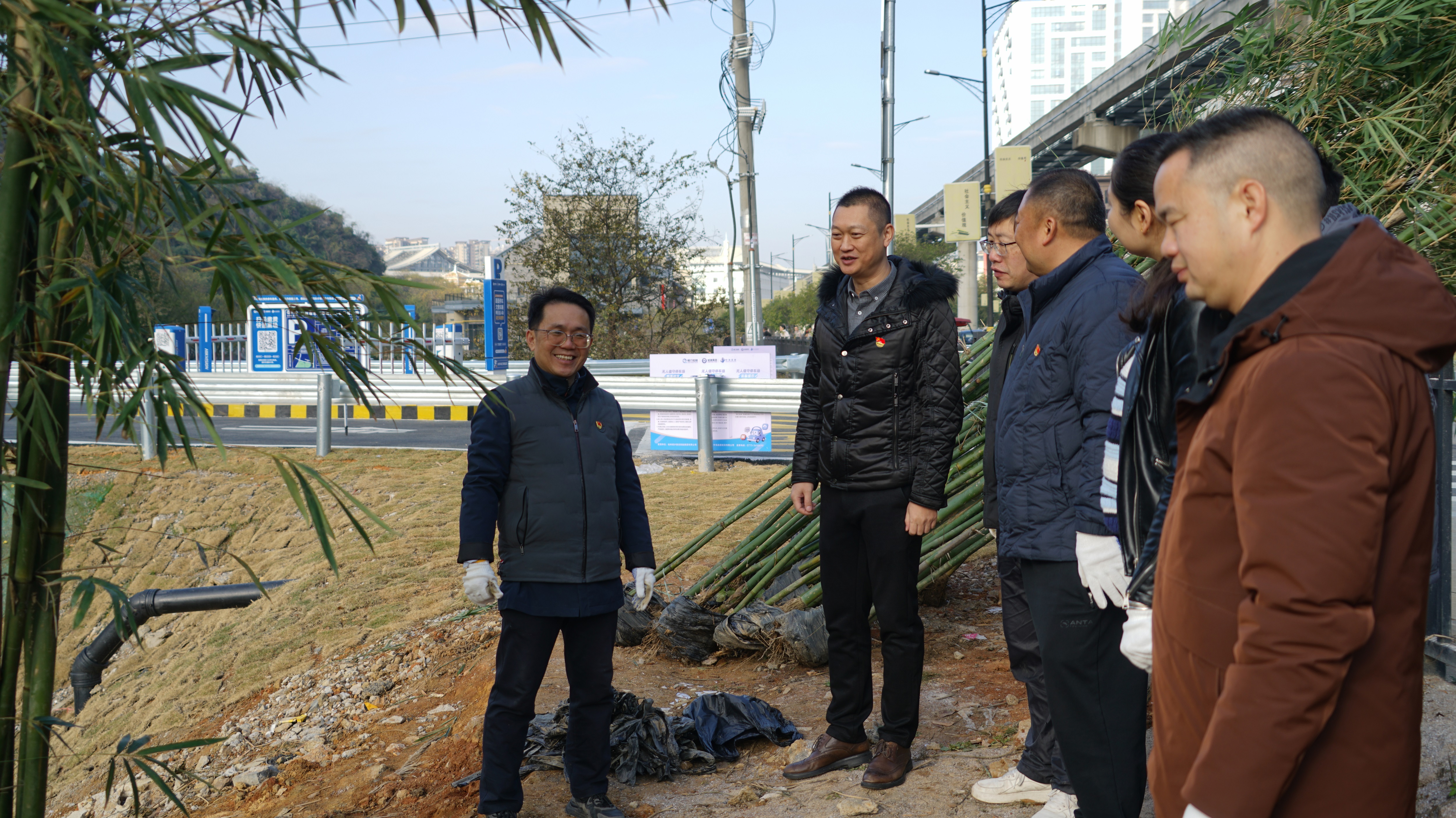 活动当天,新城投集团党委书记、董事长朱毅情系山水公园造景,为市民、游客提供更好的休闲场所,在赶飞机出差前专程前往山水公园山水街人行步道活动现场,看望慰问一线劳动的同志们,为大家加油鼓劲。朱毅书记抵达后,首先仔细察看步道周边环境与种竹作业进展,随后走进劳动队伍,与现场人员亲切交流,详细询问竹苗品种选择、种植养护要点及后续步道景观优化规划。看到大家分工有序、干劲十足,他对同志们的辛勤付出给予充分肯定,强调“人行步道是服务群众出行的‘民生道’,也是展现城市生态美的‘风景线’,此次种竹添绿不仅要栽下‘新绿’,更要栽出‘民心’,切实把实事办在群众心坎上”。同时叮嘱大家在劳动中注意保暖、保障安全,鼓励全体党员持续发挥先锋模范作用,将党建活力转化为服务城市建设、改善民生福祉的实际成效。