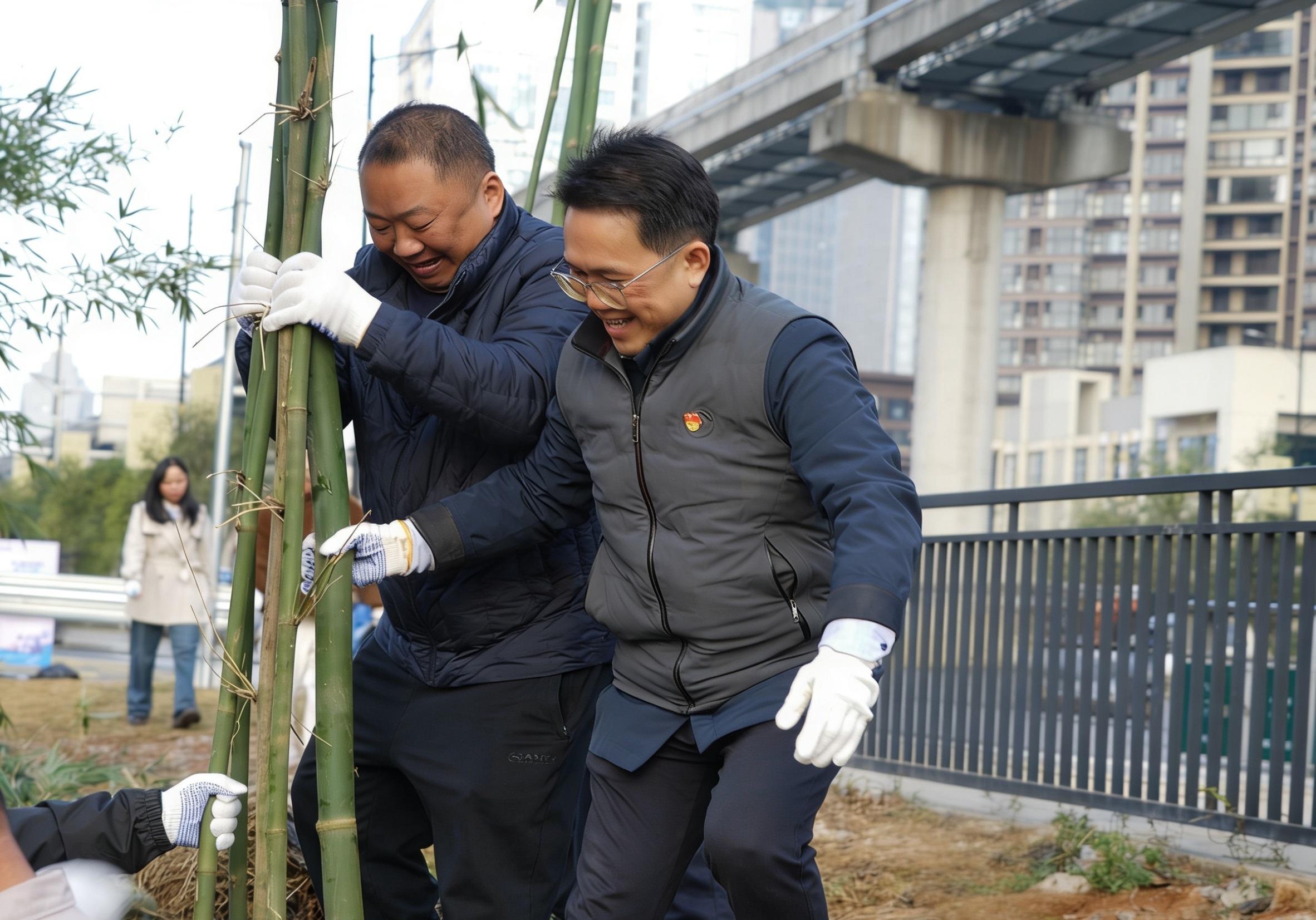冬日的微凉丝毫未减劳动热情,现场一派热火朝天的实干景象,经过近2小时奋战,一片片新竹在步道旁挺立,翠绿竹苗与整洁步道相映成趣,既为山水街人行步道增添“竹韵”生机,更让生态美景与便民需求深度融合,为市民打造出更宜行、更宜赏的游园环境。