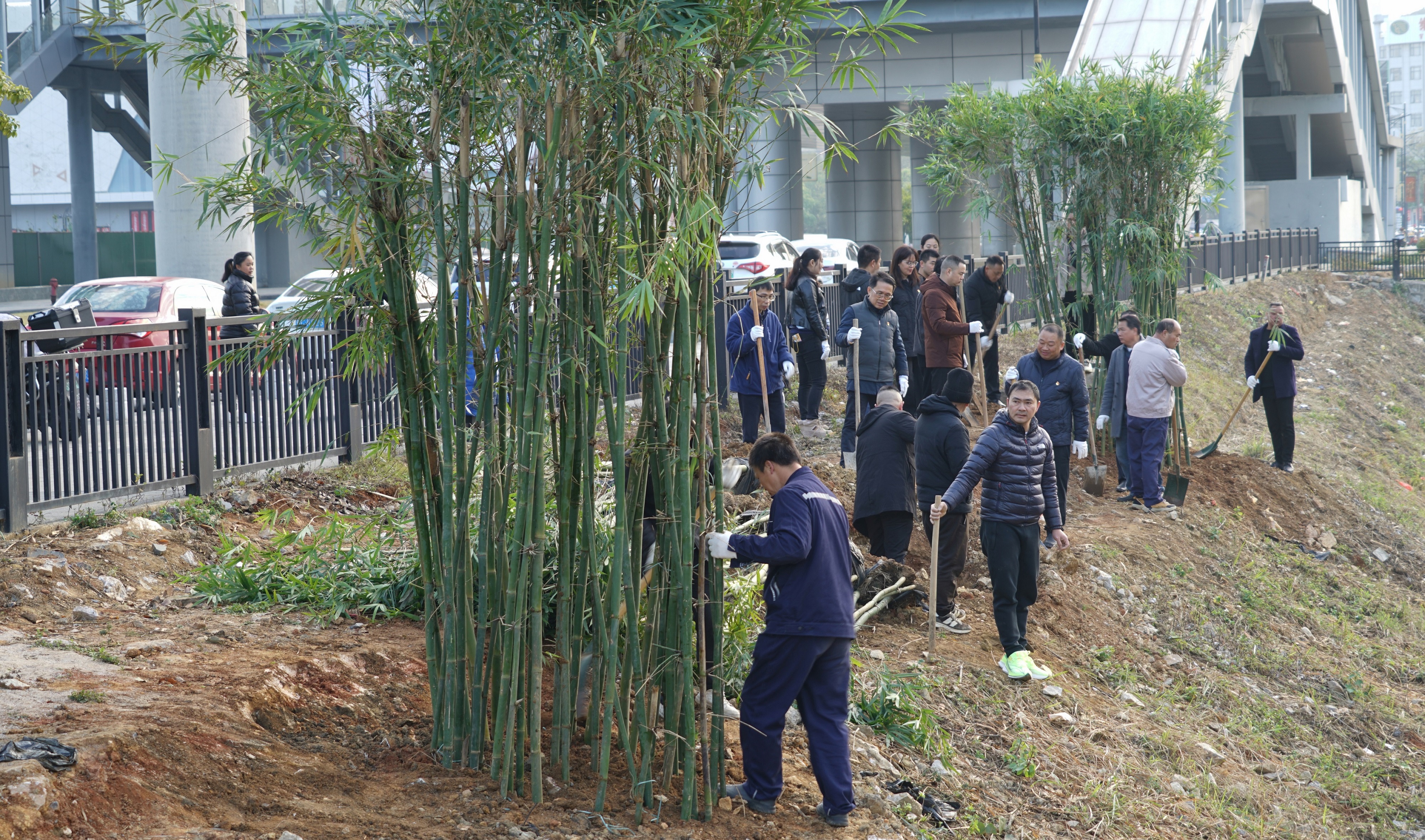 随后,种竹添绿核心环节正式启动,在宏谋城运公司工作人员的专业指导下,大家迅速分工、默契协作:有的搬运竹苗、有的挥锹挖穴、有的扶苗定植、有的培土压实,每一个动作都认真细致、有条不紊。
